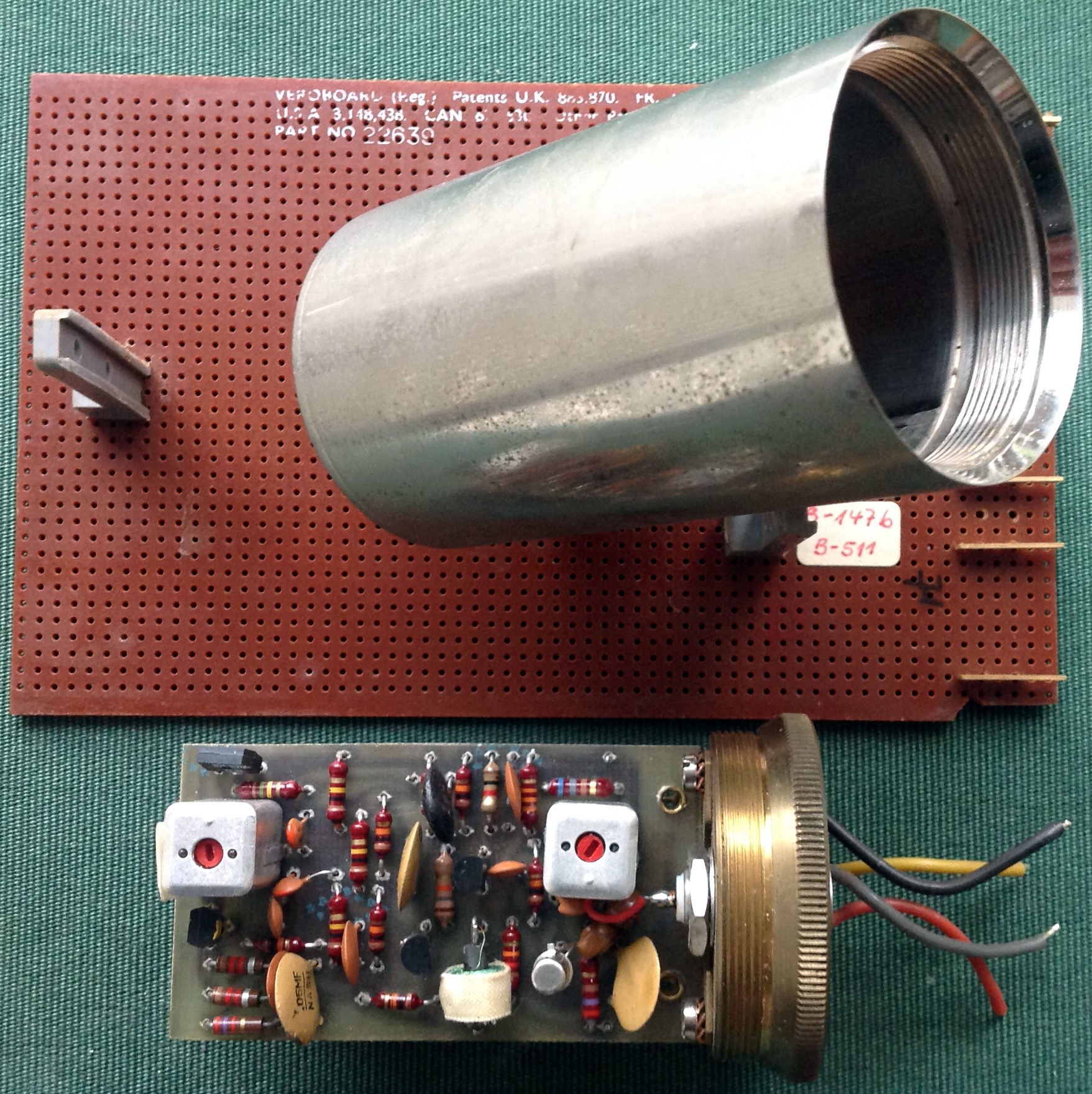 Modul B-147b; Sender 10,7 MHz mit Feineinstellung der Oszillatorfrequenz. Hermetisch geschlossenes, aufschraubbares Zylindergehäuse; nach Aufschrauben des Gehäuses war alles gut zugänglich. Habe beide HF-Transistoren (Oszillator und Verstärker) auf Verdacht hin ausgelötet und durchgemessen. Der BF241 (Osz.) zeigte im Vergleich mit einem neuen Exemplar atypische Werte am Ohmmeter. Nach dessen Austausch: Funktion nun O.K.