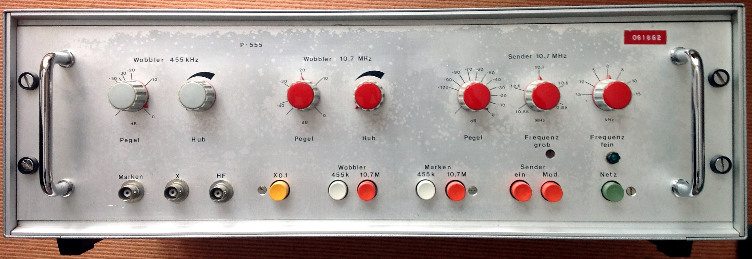 Es handelt sich hierbei um einen zur hauseigenen Nutzung vorgesehenen ZF-Messsender für 10,7 MHz mit zusätzlichen Wobbel-Generatoren für 10,7 MHz und 455 KHz. Gleich nachdem ich ihn bekommen hatte, schloss ich ihn an und wollte ihn ausprobieren, aber die Kiste war komplett tot. Etwas enttäuscht stellte ich sie wieder zur Seite und dachte mir, dass ich sie erst wieder hervorholen würde, wenn ich sonst nichts besseres zu tun hätte. Seither sind nun fast 2 Jahre vergangen, und nachdem ich inzwischen nun doch ein paar Mal zu ihr hinüber geschielt hatte, war es dann soweit.
