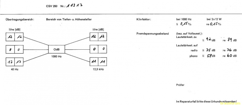 - Signal-Rauschabstand mit aufgedrehtem (Hochpegeleingang und Phonoeingang)und zugedrehtem Lautstärkeregler bezogen auf 20 Watt Sinus Ausgangsleistung