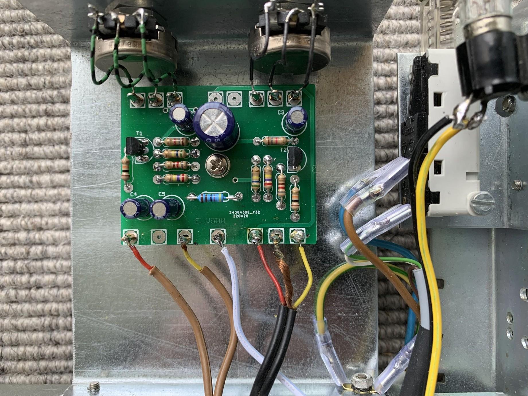 Vermutlich um die Pegelverluste durch die Übertrager am Ausgang des externen Vorverstärkers ESV 400 wieder auszugleichen und zum kanalgetrennten Einpegeln der Endstufe, wurde vor deren Eingänge ein kleiner einstufiger Vorverstärker mit zwei getrennten Potentiometern vorgesehen. Da die Netzteilplatine des (echten) ELV 500 keine elektronische Sicherung für die Endstufe enthält, wurde diese vom Hersteller einfach mit auf die Platine des kleinen Vorverstärkers gepackt.