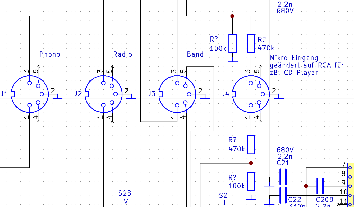 As a result, you will get much lower input sensitivity for the line inputs, and consistent phase on all inputs. You can get rid of the voltage dividers on the inputs and replace the resistors on the source selector with wire.