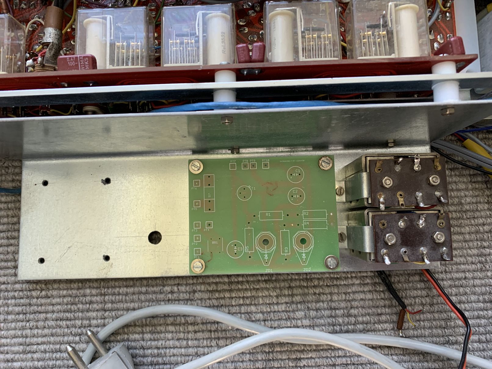 Da keine weiteren "echten" ELV 500 verfügbar waren, ließ Ede neben den Metallarbeiten auch Platinen für das Netzteil nachfertigen, die ebenfalls sehr gut gefertigt wurden. Auf dem Bild ist diese Platine (unbestückt) zu sehen, der leere Platz ist für den neuen Netztrafo reserviert, unterhalb der Netzteilplatine sieht man die beiden Ausgangstrafos, die für einen für den potentialfreien NF-Ausgang sorgen: