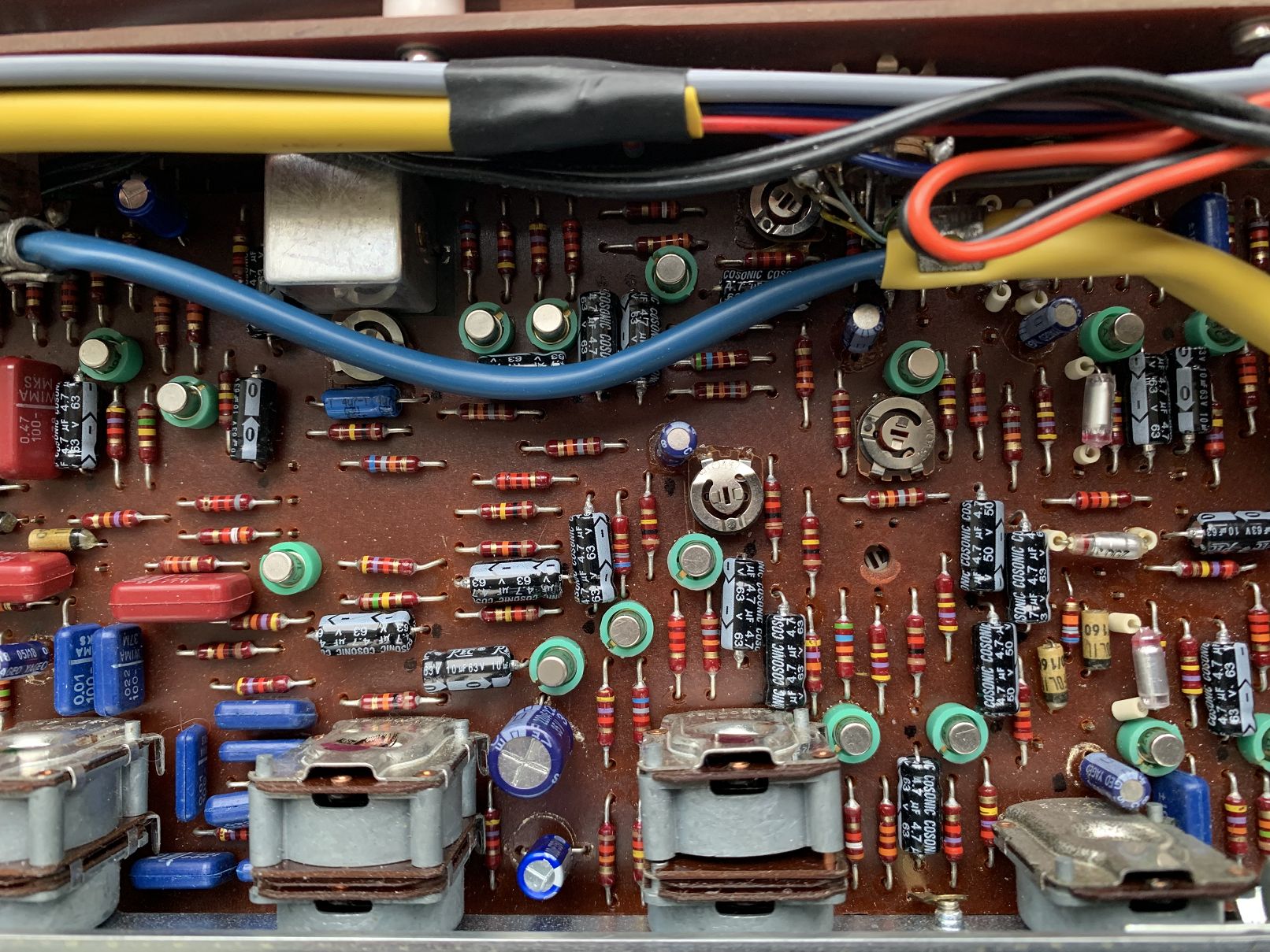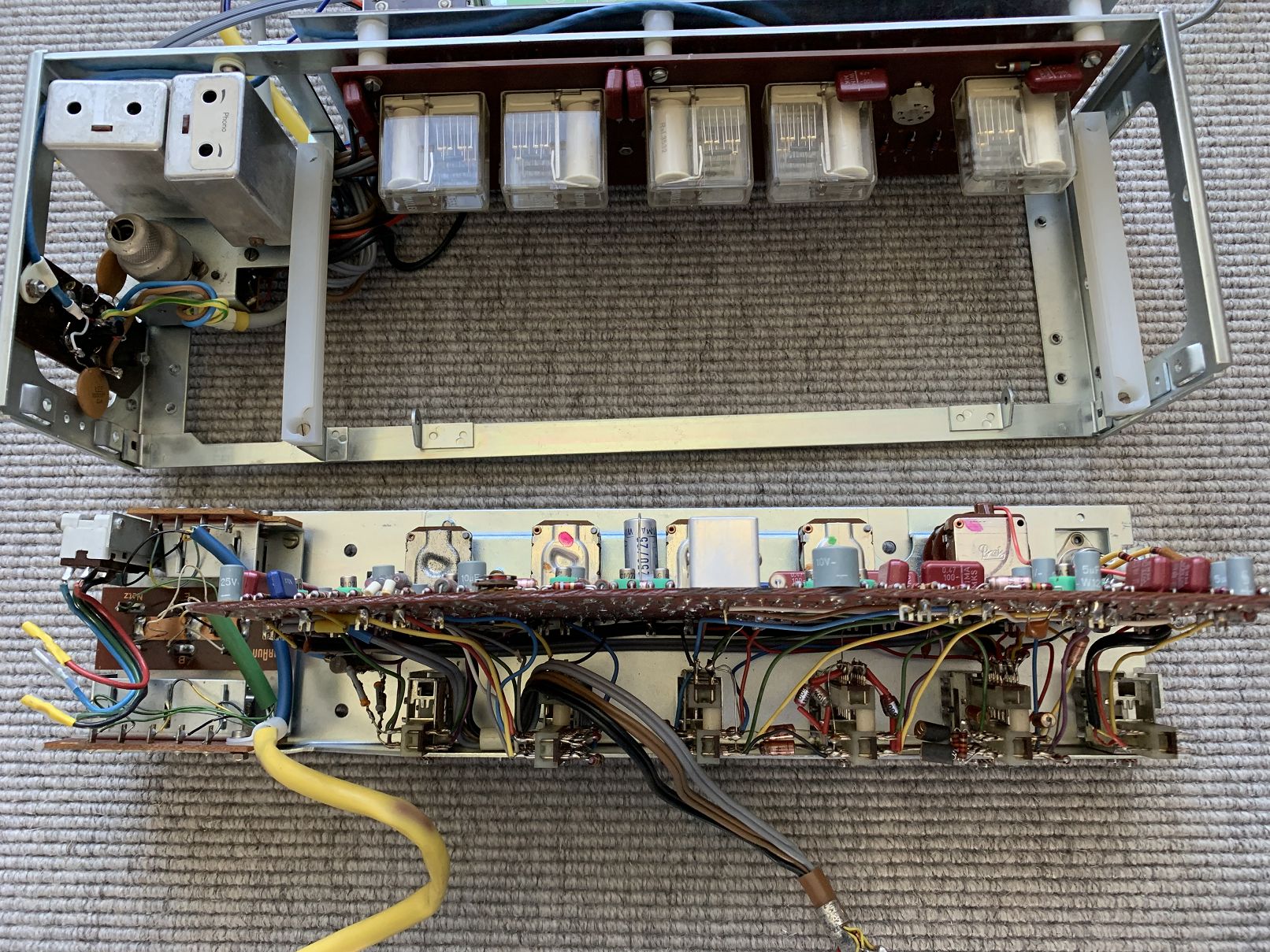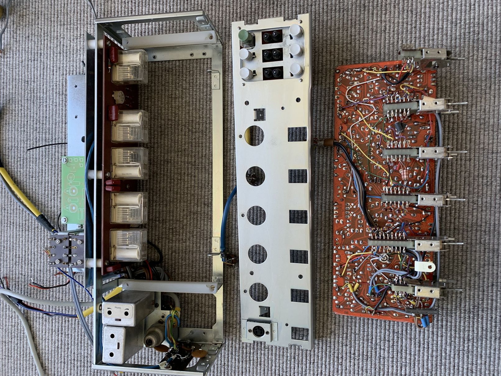Zusammen mit den beiden Phono- und Mikrofon-Vorverstärkermodulen waren wieder mal 70 Elkos aus- und einzulöten. Nicht, dass das unbedingt Spaß gemacht hätte.