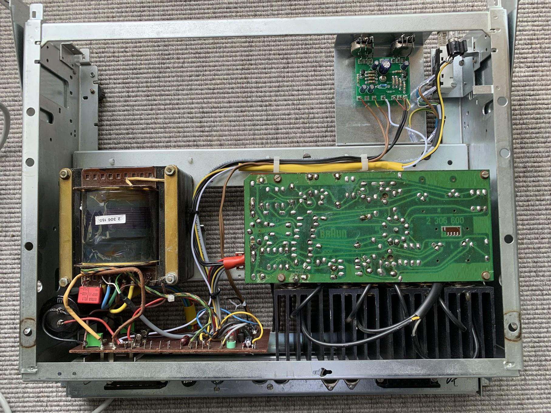 Zunächst habe ich mich um die Stromversorgung gekümmert. Der Ladeelko im Netzteil (4.700 µF/100 V links unten im Bild) wurde als erstes erneuert. Die 30V-Versorgung für den Vorverstärker auf der (senkrecht stehenden) Netzteilplatine wurde schon ab Werk nicht bestückt, da es sich ja um einen DSV 2 handelte. Allerdings musste ich noch einen Vorwiderstand für das Kontrolllämpchen über (dem Netzschalter) ergänzen, auch einen Entstörkondensator am Netztrafo habe ich nachgerüstet.
