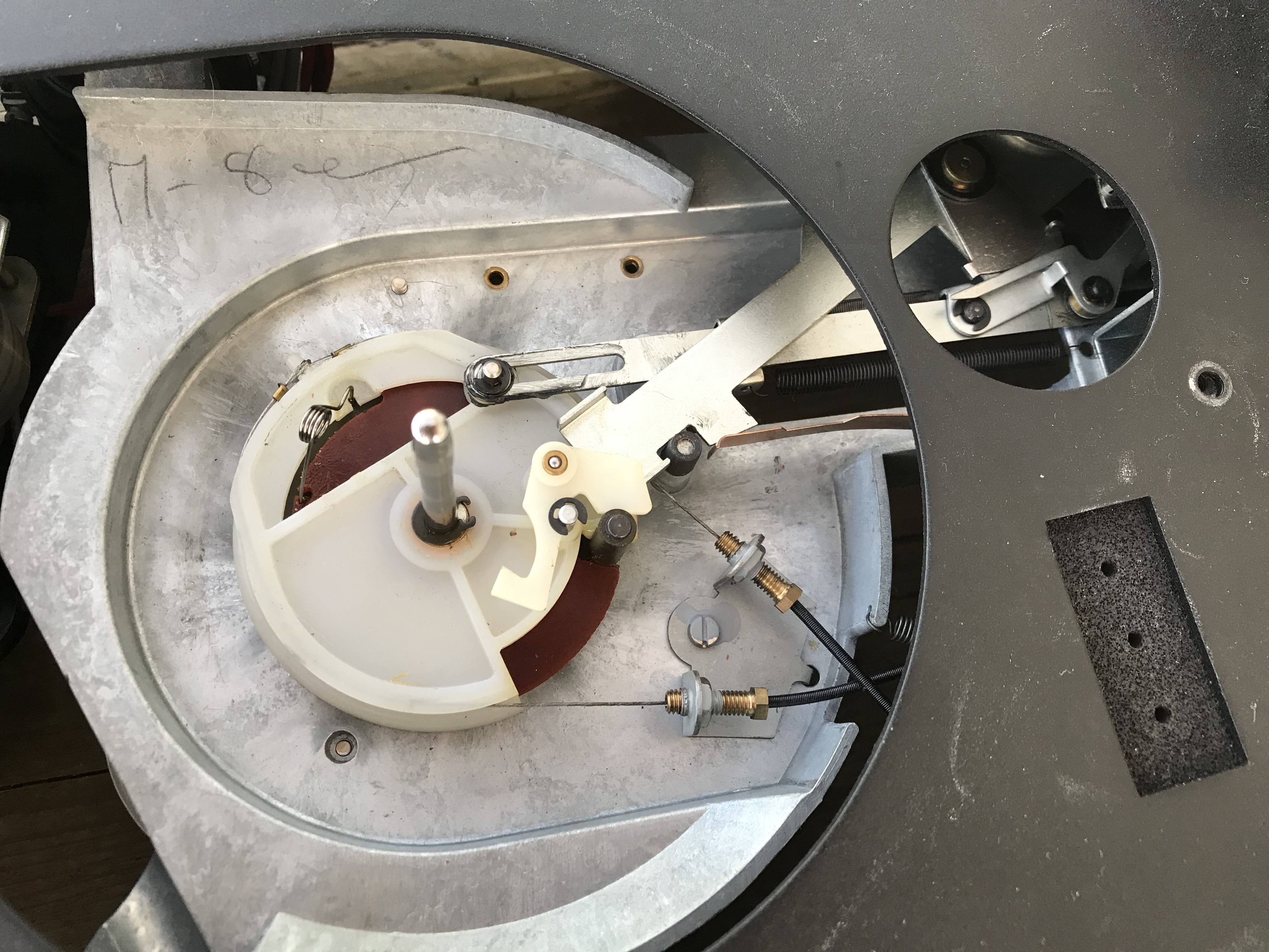 Wenn das Silikonöl verharzt ist "denkt" die Endabschaltung dass der Tonarm noch nicht lange genug über der Platte ist und erkennt die Auslaufrille nicht. Wenn das System mit normalem Öl gängig gemacht wird, hat man das Problem, dass die Endabschaltung schon beim Führen des Tonarms zur Startrille aktiviert wird. Durch das kleine Loch links von dem Unterteller kann man die Bewegung der Bleche sehen (bei abgenommenem Plattenteller).