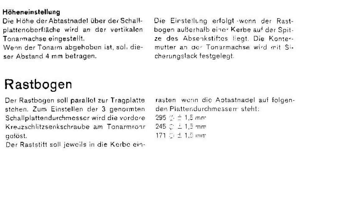 Im Prinzip funktioniert mein Gerät nun einwandfrei. Das letzte, und vielleicht wichtigste Detail, welches ich bisher nicht beheben konnte, ist die Verstellbarkeit der Höhe des Tonarms, denn die Nadel setzt nicht auf. Am Tonarmlift befindet sich eine kleine Stellschraube, die leider nicht ausreichend verstellbar ist. Und somit Hängt die Nadel in der Luft und wartet vergebens auf den Kontakt mit der Platte. Da Beide Elemente (Tonarm und Tonarmlift) mit der Aufhängung verbunden sind, muss das Höhenverhältnis verstellt sein. Ich Vermute, da ich das Gerät ohne Sicherungsschauben bekommen habe.