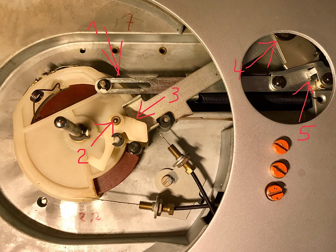 Ich habe mir das heute mal angesehen, verstehe die Mechanik jetzt schon besser. Wenn ich diese jetzt mal neu fetten möchte, an welchen Stellen müsste ich da ansetzen? Ich habe einfach mal auf Verdacht mit 1 - 5 markiert, wo ich neues Fett auftragen würde. Käme das ungefähr hin oder fehlt eine Stelle? Dann stellt sich mir die Frage, welches Mittel das sinnvollste wäre.