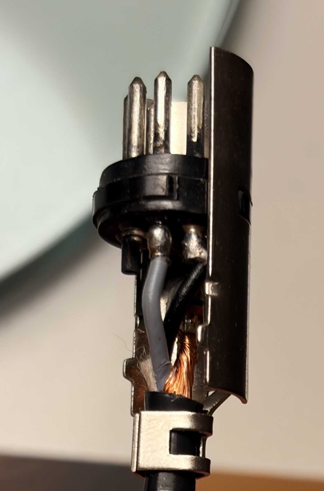 Der fotografierte Din-Stecker des Braun-Plattenspielers hat auf der Lötseite einen schmalen flachen Metallstreifen,