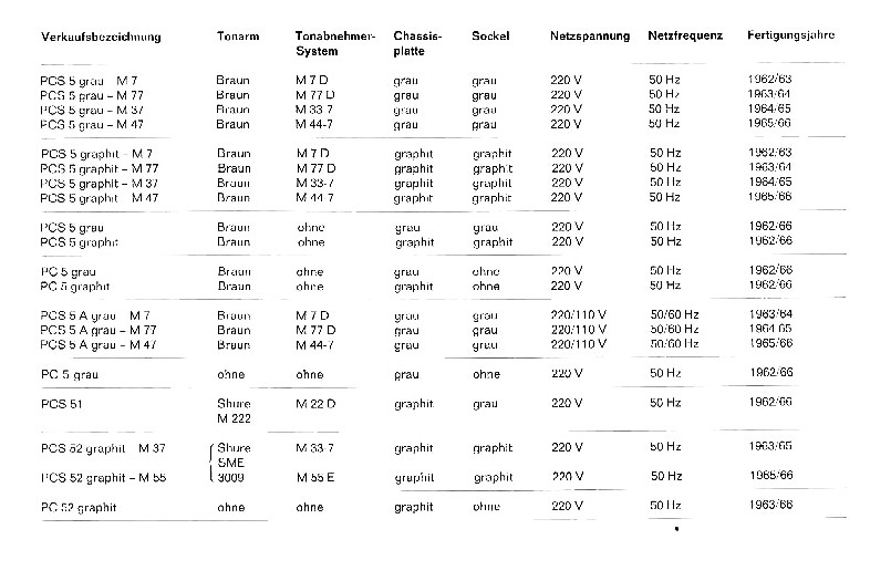 PCS 51 mit Tonarm Shure stereodynetic, PCS 52 (E) mit Tonarm SME 3009. Alle gab es unterschiedlichen