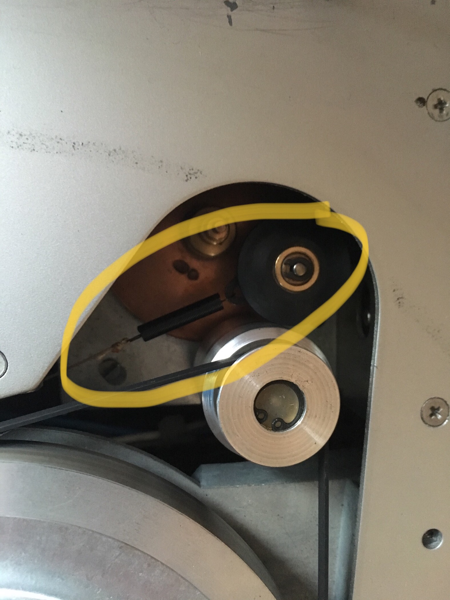 die silberne Rolle bewegt sich nicht, wenn ich es anstelle. Sie lässt sich aber von Hand drehen. Der Riemen ist ganz gut gespannt und bewegt sich dann mit.