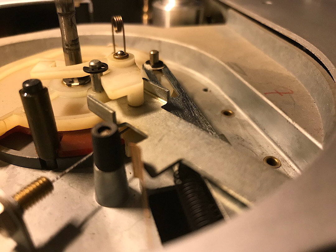 Mir fällt auf, dass das hochgebogene Blech sehr spät auslöst und dann der weiße Hacken trotzdem nicht mitgenommen wird. Ohne Teller merkt man am Tonarm erst einen Widerstand, wenn der Tonarm eigentlich in der Mitte ist.