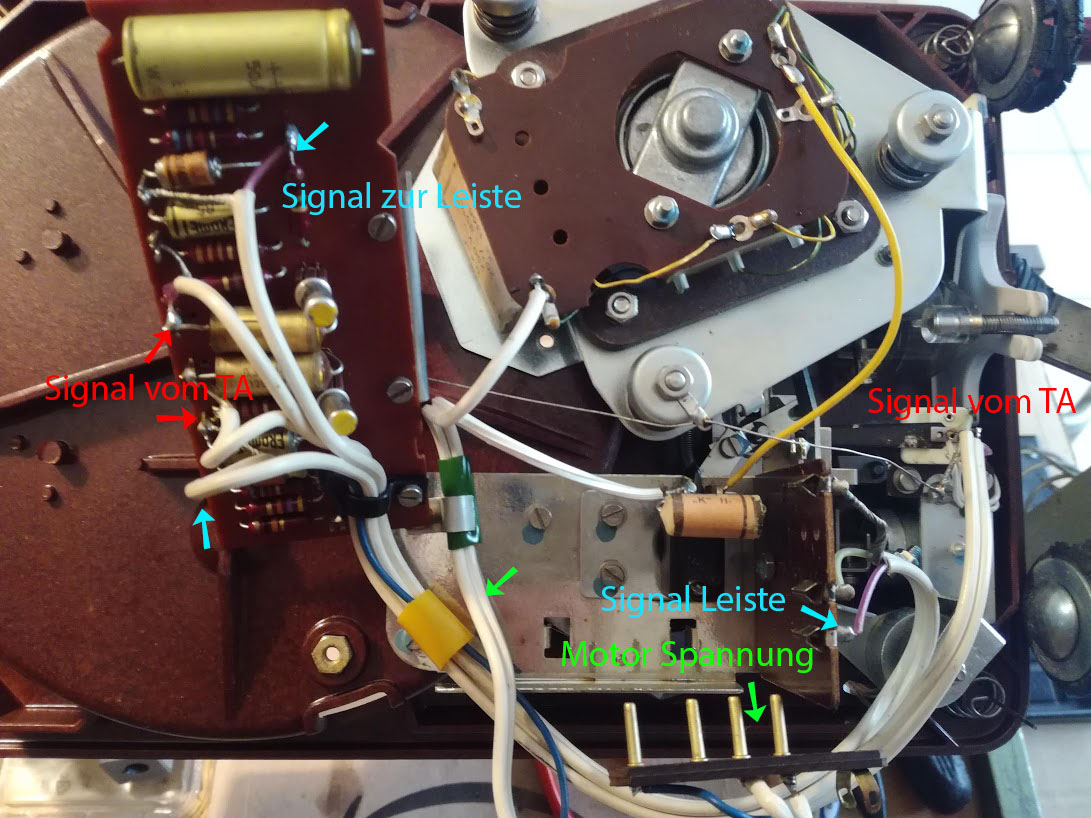 Ein weiteres Problem habe ich mit den Anschlüssen. Mir wird nicht ersichtlich, wo die Spannungsversorgung angelegt ist und wo der Ton abgenommen wird. Der auf dem Bild gezeigte Stecker passt zwar in die Buchsenleiste, er führt das weiße Spannungskabel zum Motor. Die Buchsenleiste nimmt die Signale (r+l+Masse) vom VV auf, müsste aber auch an 115 Volt für den Motor hängen. Würde ich nun ich den Stecker in die Leiste stecken und lege dort Spannung an, bekämen Motor und die VV über Blau 115 Volt Spannung, Demnach wird die VV mit dem Signal vor den Elkos versorgt und auf der Gegenseite mit 115 Volt gespeist. Ich bezeifele, dass das richtig ist!? Wo nehme ich das Signal dann ab und wo wird die Spannungsversorgung angelegt?