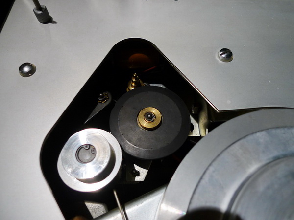 Wenn Du den Plattenteller abnimmst, so siehst Du entweder ein zweites Loch gleich neben dem Ausschnitt fuer den Antrieb, oder eine verchromte Schraube mit einer Plastikunterlegscheibe (siehe Bild). Die beiden Schrauben dienen der Befestigung des Motortragebuegels. Diese Ausfuehrung gab es nur bei den fruehen PS1000 Modellen.