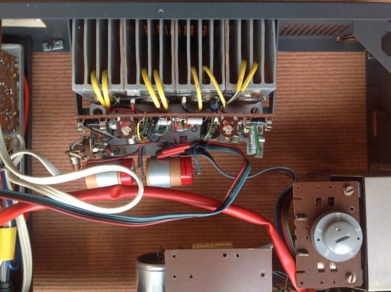 Schritt 5: Endstufe. Die Netzsicherung wurde von einem umsichtigen Vorbesitzer in einer 2 Ampere-Variante eingesetzt, vermutlich mit dem fürsorglichen Hintergedanken, dass ihr ja nichts passieren sollte. Ich wagte es dennoch, sie gegen eine solche mit dem vorgeschriebenen Nennstrom von 315 mA auszutauschen. Und siehe da, sie hielt. Ob das daran lag, dass beide Endstufensicherungen durchgebrannt waren? Nach Ablöten der Endtransistoren (AD131) ergaben die Messungen, dass alle vier einen Kurzschluss aufwiesen. Natürlich habe ich sie erneuert.