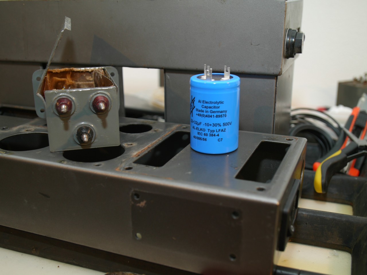 Sie haben die Bezeichnung C609 und C709 - jeweils 2500 µF, 50 V (laut Ersatzteilliste). Die heutigen Elkos sind von der Bauform kleiner, auch wenn Du 63 V-Typen nimmst. Eine Möglichkeit wäre, die alten Becher zu "entkernen", um darin mit z.B. schwarzer Dichtungsmasse die neuen Teile einzupflanzen. Habe ich schon mal auf einer Seite zur Restauration von Radio-Oldtimern gesehen.