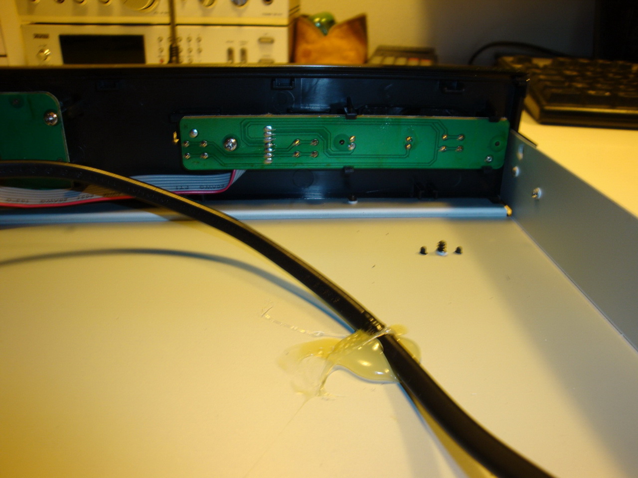Das Innere ist ein wenig ernüchternd: Viel Luft und schlampig mit viel Heißkleber zusammengeschustert. Man beachte die völlig sinnfreie Stahlplatte in der Mitte des Gerätebodens. Soll das Gerät wohl etwas schwerer machen und damit "wertiger" wirken. Das Display hat die Maße 57 x 30 mm