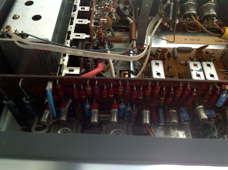 Einblick in das Empfängerteil Die Endstufe vor der Reparatur Schritt 4: Rundumschlag. Erneuern sämtlicher Elkos im Gerät. Seien sie geschraubt, auf Lötösen verdrahtet oder auf Platinen bestückt – frei nach dem Slogan: Alles muss raus! (Und das schon nach 53 Jahren.)
