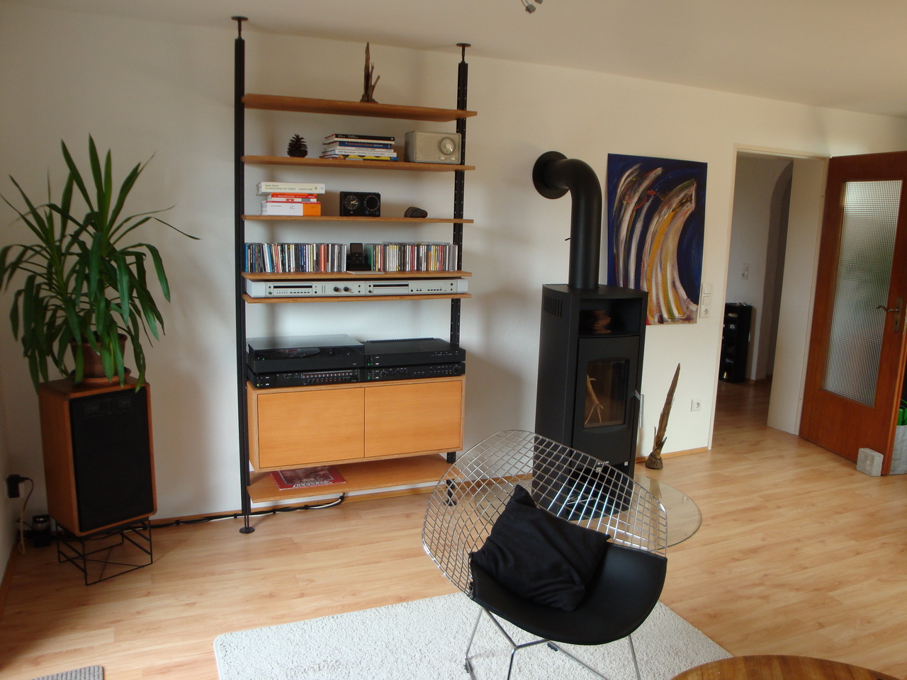 anlässlich meines Umzugs im April dieses Jahres habe ich endlich vom Schreiner meines Vertrauens die zur Breite und Tiefe der studioline-Geräte passenden Holzelemente für mein Spannstützenregal anfertigen lassen. Das Material ist Birke Multiplex 18 mm, Deckfurnier Buche (A/B-Qualität), Oberfläche geölt.