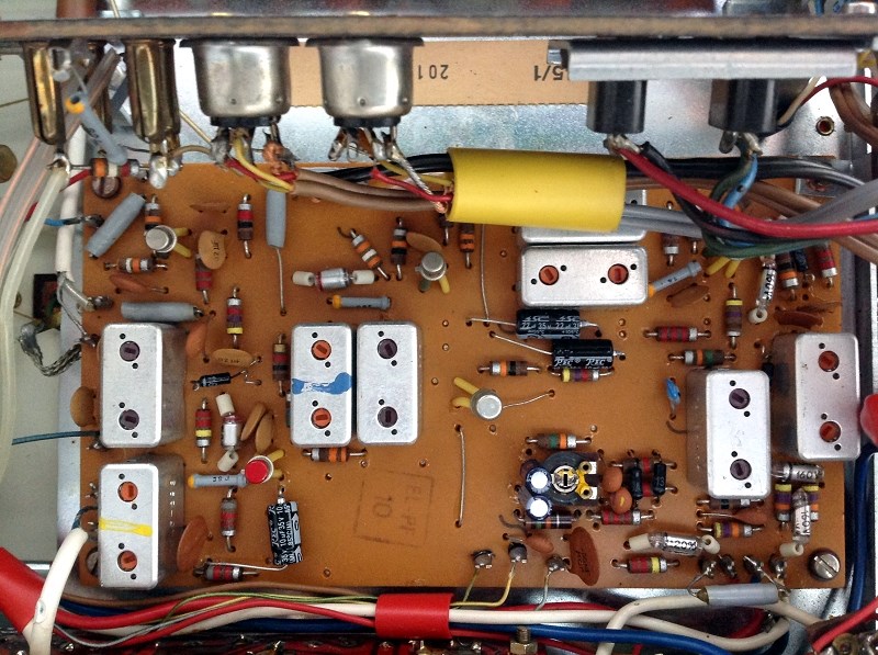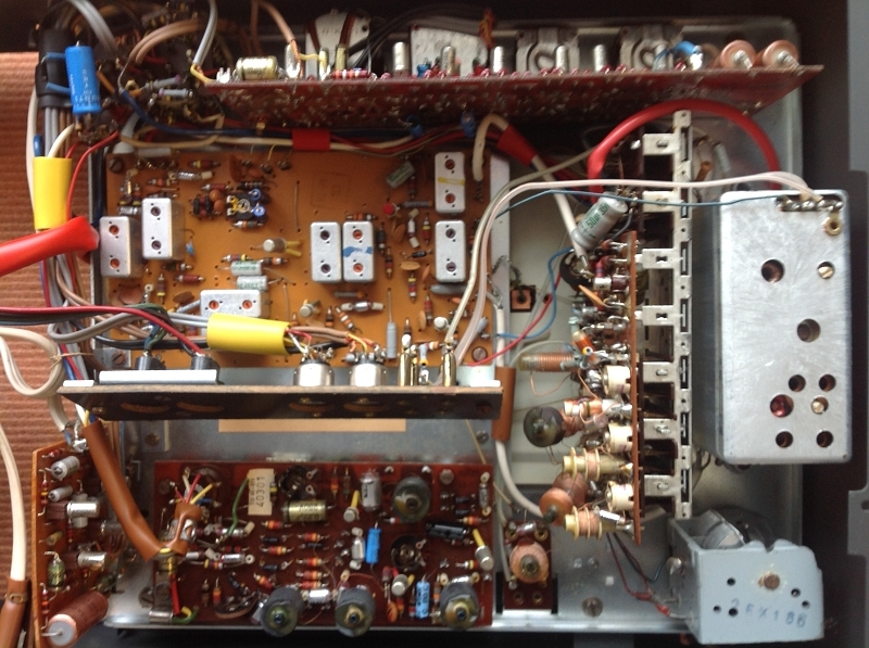 Einblick in das Empfängerteil Die Endstufe vor der Reparatur Schritt 4: Rundumschlag. Erneuern sämtlicher Elkos im Gerät. Seien sie geschraubt, auf Lötösen verdrahtet oder auf Platinen bestückt – frei nach dem Slogan: Alles muss raus! (Und das schon nach 53 Jahren.)