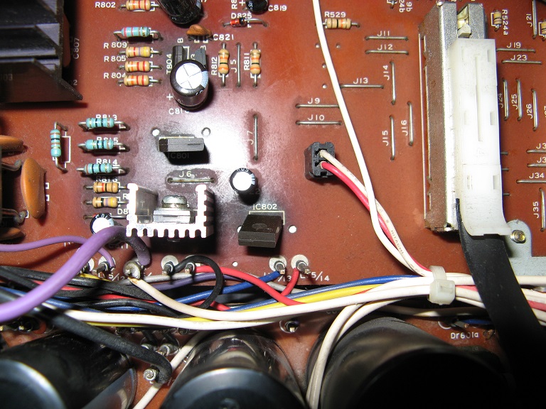 Drahtanschlüsse (unter IC802) von rechts: LV5/14 (rot), LV5/13 (blau), LV5/15 (rot), LV5/18 (schwarz), LV5/33 (violett u. weiß), LV5/12 (violett), LV5/11 (gelb)