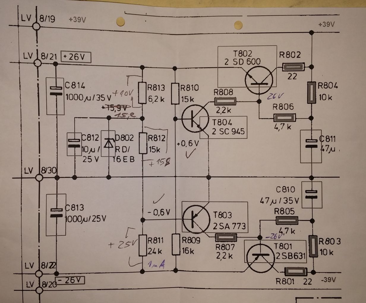ich kenne den A2 leider überhaupt nicht, aber ist die mittlere Leitung Masse (LV8/30)? Wenn ja, würde 1.9V an der Basis von T804 bedeuten der Transistor ist kaputt oder der falsche Typ. Ein NPN Transistor hat typischerweise ein Flussspannung von 0.7V. Ganz blöde Vermutung: T803 und T804 ausversehen vertauscht? Was für Ersatztypen hast du da eingebaut? Ansonsten würde ich mich erstmal auf die untere Hälfte (negative Spannung) konzentrieren, da die wohl die Referenz für die positive ist.