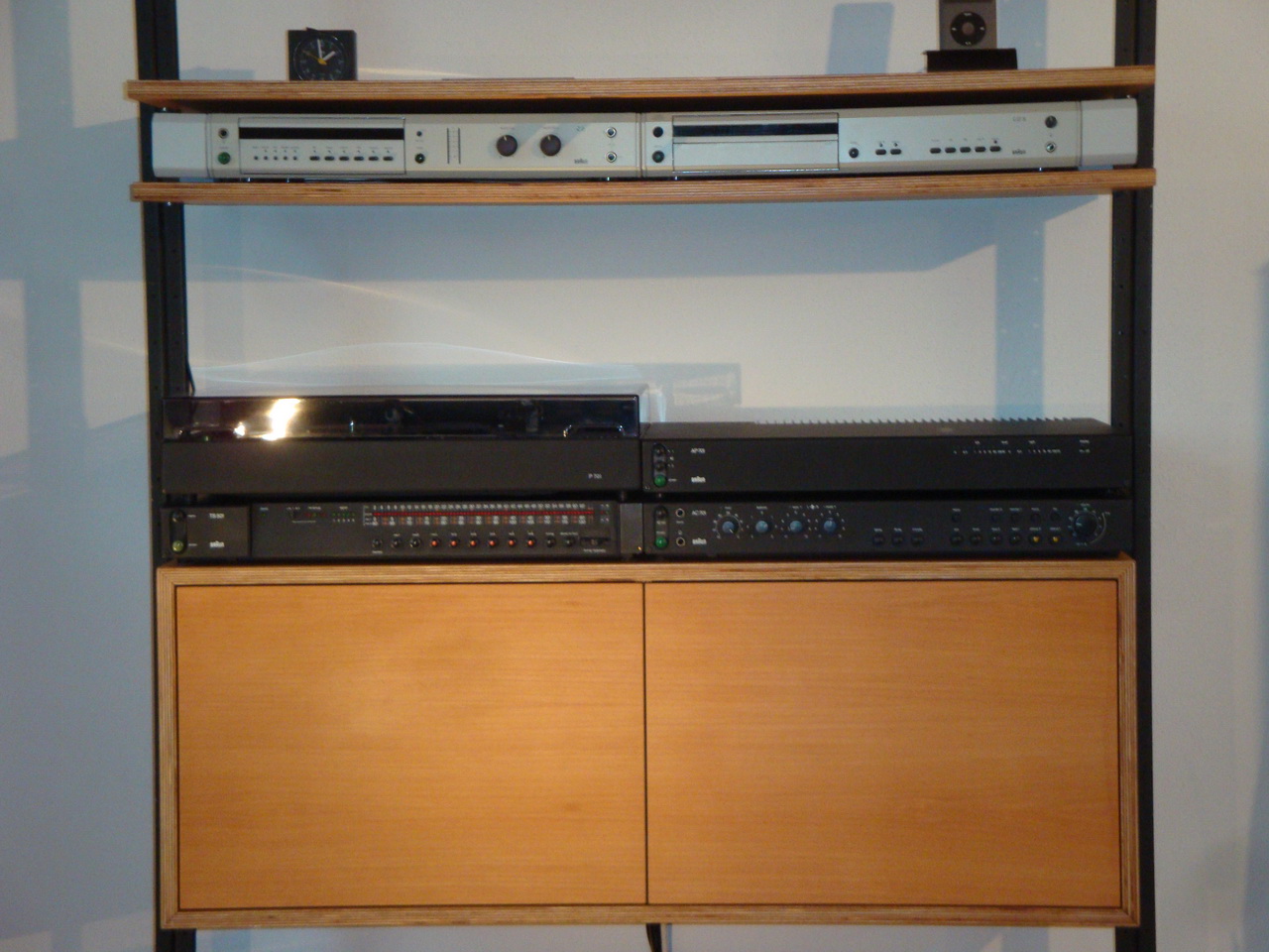 anlässlich meines Umzugs im April dieses Jahres habe ich endlich vom Schreiner meines Vertrauens die zur Breite und Tiefe der studioline-Geräte passenden Holzelemente für mein Spannstützenregal anfertigen lassen. Das Material ist Birke Multiplex 18 mm, Deckfurnier Buche (A/B-Qualität), Oberfläche geölt.