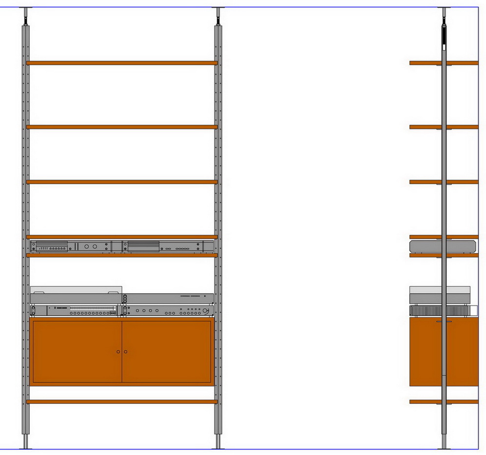 Dann kenne ich auch noch ein System mit Rundstützen „Rohr in Rohr“ mit inneren Spannfedern und seitlich einhängbaren Auflagerwinkeln für die Fachböden. Hatte ein Studienkollege in seinem WG-Zimmer stehen, Vater war Architekt. Formal absolut o.k., aber recht wackelig und nur für leichte Sachen geeignet. Wenn’s jemand kennt (Designer / Hersteller), bitte auch hierzu gerne hier nähere Infos.