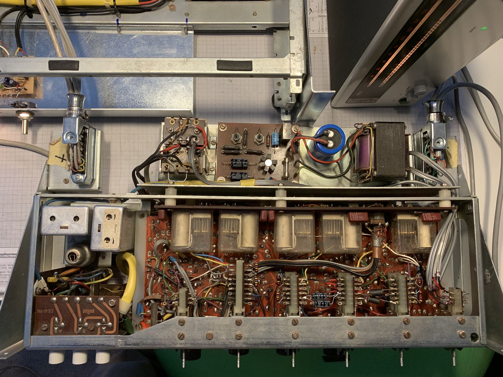 Hier kann man neben dem hinten angeflanschten Anschlussfeld mit den Ein- und Ausgängen auch das Tragblech für den kleinen Vorverstärker mit den beiden Pegelreglern sehen. Den Grund für die überreichliche, scheinbar unnötige Länge des Tragblechs kann ich mir nur damit erlären, dass es auch eine Abschirmfunktion erfüllt, wenn sich direkt darunter ein ESV400 befindet. In diesem Bereich befinden sich nämlich die ersten, d.h. die brummempfindlicheren Verstärkerstufen des ESV400.