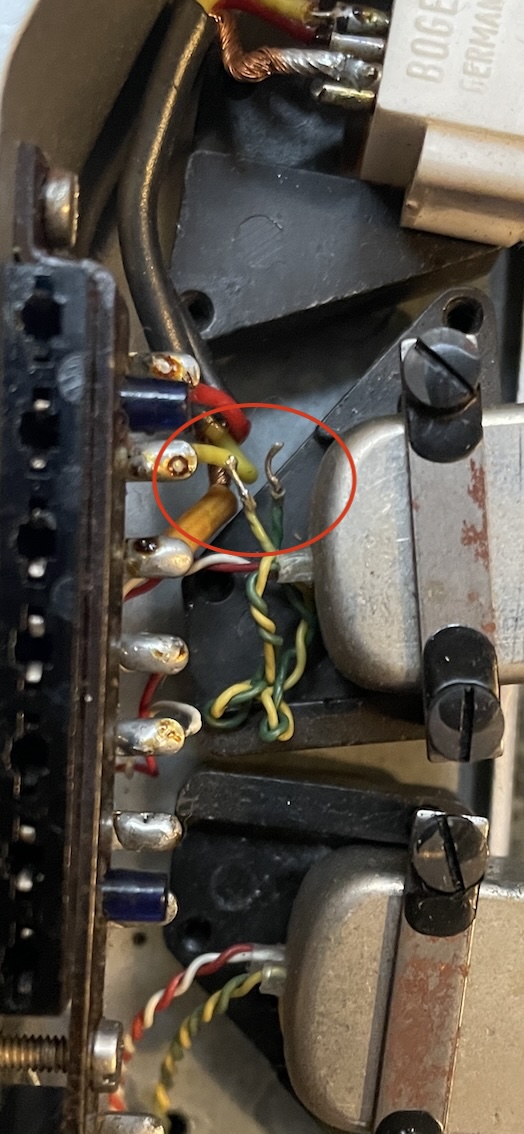 Nachdem ich die elektronischen Komponenten und den Spurumschalter als Fehlerquelle ausgeschlossen hatte, nahm ich mir den Kopfträger vor, und hier war der Fehler: es sind beide Drähte eines Kanals des Aufnahmekopfs an der Steckbuchse abgerissen. Zudem sind sie von den Kontakten offensichtlich weggebogen worden, daher meine Annahme der „Sabotage“ (nicht ganz ernst gemeint :) )