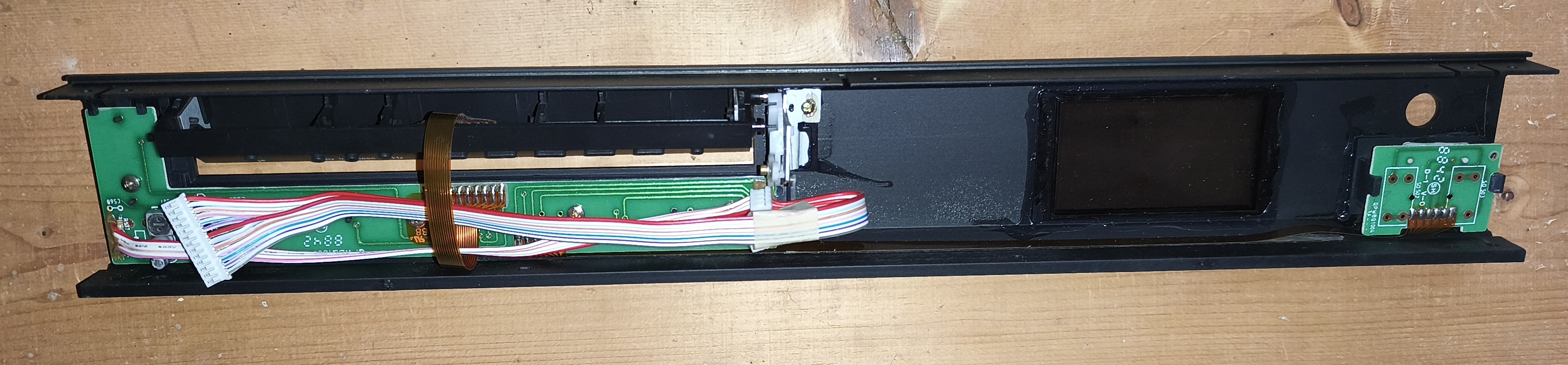 Scheint ein Zwitter zu sein, denn das Anschlusskabel für die Frontblenden Ortsbedienung stammt aus einem /1ser. Kann man aber leicht gegen die /2er Version der Original Blende tauschen. Dabei beachten, die Anschlusskabel vom Klebstoff zu befreien. Die Platine für LS Wippe/Mute Taste hängt mit Flexi Kabel mit an der /1ser Platine, also Vorsicht.