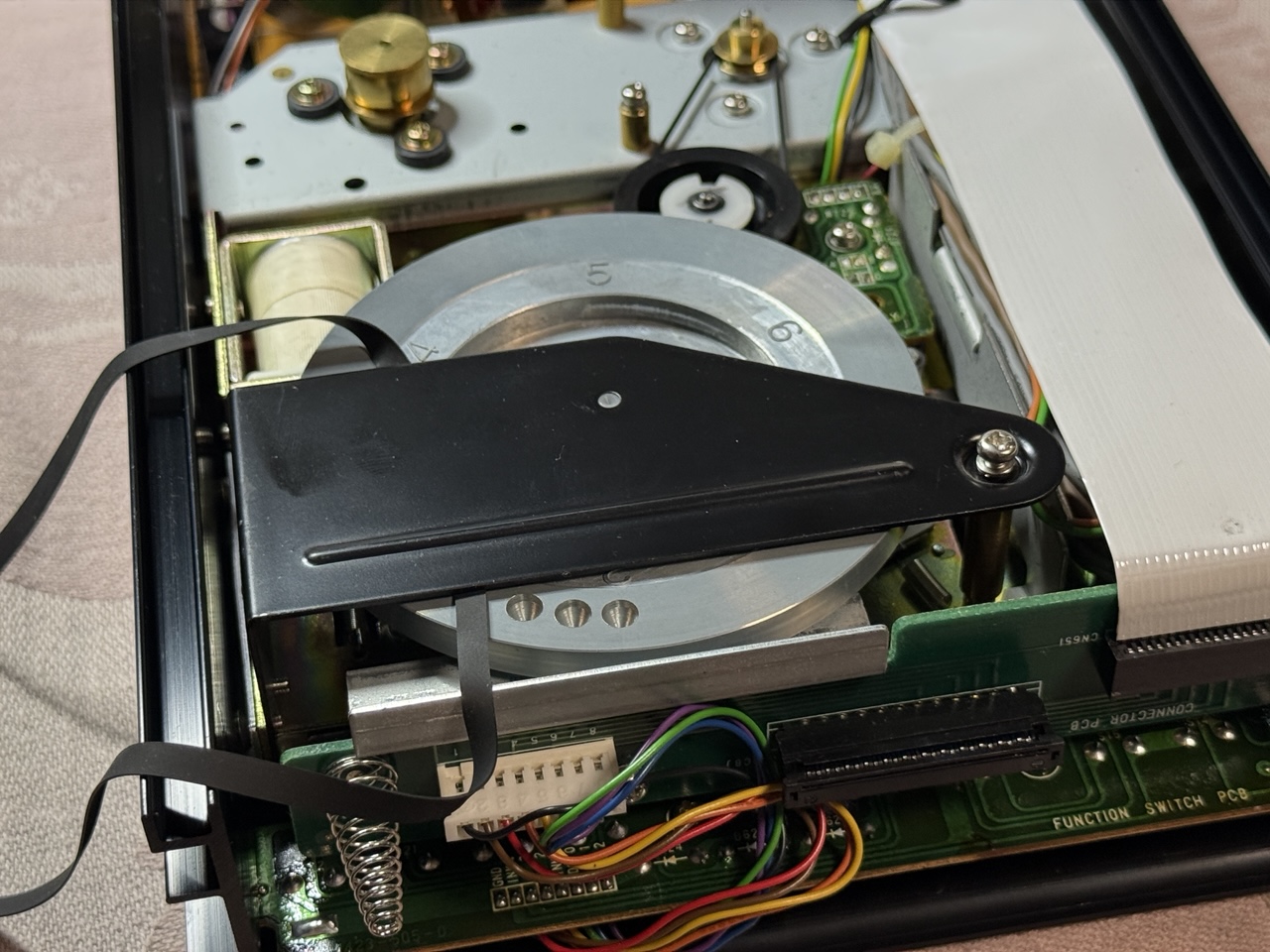 Die Anleitung unter "Atelier-Reihe wichtig" hatte ich studiert. Leider musste ich zum Entfernen besagter teerartiger Masse doch mehr Teile entfernen, um die Schwungmasse vom Capstan auszubauen.