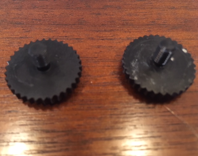 Reproduction on the left. Hard to see any differences other than the black finish is more matte than the original. Also the "teeth" are slightly sharper on the new ones. Really great quality reproductions that installed perfectly into the stands.