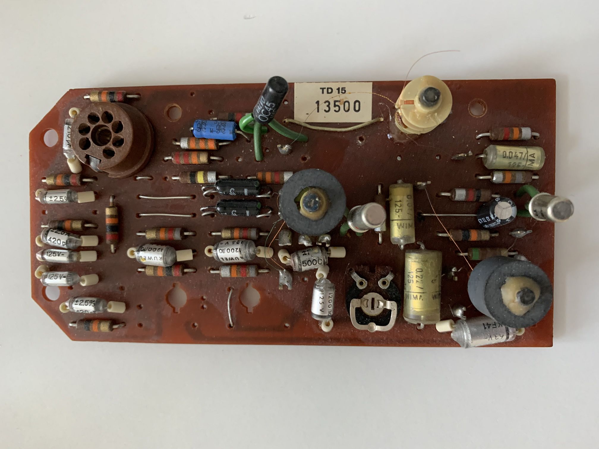 hier ein Foto von einem TD 15 und der dazu passende Auszug aus den Serviceunterlagen für den CET15. Leider funktioniert mein TD 15 (Ersatzteil aus einem Schlachtgerät) nicht; die 19 KHz-Spule mit der Bauvorschrift 2080 ist defekt. Ein Drähtchen ist abgerissen und mir scheint, dass auch schon einige Windungen abgewickelt wurden.