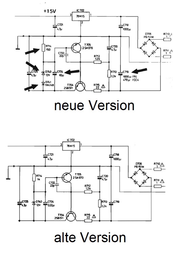 Das regt mich jetzt so auf, dass ich sofort wieder mit meinem Vorhaben, nicht mehr aktiv mitzuarbeiten, breche. Zuerst habe ich mir noch gesagt, lass ihn doch suchen. Den Fehler wird er sich schon selber eingebaut haben. CC4 selber revidiert, eine alte Version aus der Herstellung auf dem Tisch, in der die Serviceänderung von Braun noch nicht eingeflossen ist und ein Servicemanual, welches die Serviceänderung schon eingezeichnet hat. Die Cs beim Auslöten nicht geprüft und beim Einbau nach dem Servicemanual stur die Werte genommen. Schon ist der Fehler da. Obwohl ich keine Glaskugel hier habe wette ich, dass der ursprüngliche Wert des 724 220nF war. Ich habe keine Lust auf Romane. Wenn Dein C 724 den Wert 10µF hat, ändere den in 220nF und teste noch mal. Wenn der Fehler dann weg ist, nehme ich ein Dankeschön gerne an, ich wage mich so weit aus dem Fenster, dass Du den Fehler sonst nie gefunden hättest. Da Du die Service CD ja hast, die Service Änderung ist in meiner Version jedenfalls enthalten. Die Fehlerbeschreibung ist da allerdings anders. Ich habe aber schon in meinem ersten Posting in diesem Thread geschrieben, dass der C 724 nicht das einzige Bauteil ist, was bei dieser Serviceänderung angefasst werden muss. Wenn der Fehler dann immer noch drin ist, bin ich eh raus.