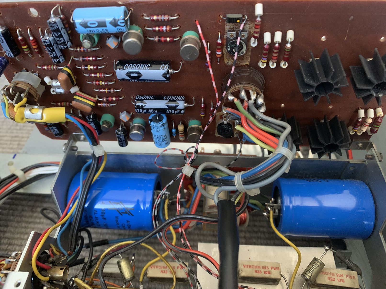 Dann wurde die Netzspannung am Verstärker mit dem Regeltrafo langsam hochgefahren. Bei einer Spannung von 20V am Ladeelko (reguläre Spannung am Ladeelko: 65V) war der linke Kanal des Verstärkers bereits einigermaßen funktionsfähig; der rechte Kanal brummte etwas und blieb ansonsten stumm. Bei etwas über 25V am Ladeelko brummte der rechte Kanal etwas vernehmlicher und unter der nur leicht hochgeklappten Endstufenplatine traten kleine Rauchwölkchen hervor. Schnell ausgeschaltet und den frisch gebräunten Emitterwiderstand eines Treibertransistors ersetzt. Als nächstes wurde nur noch gemessen. Dabei ergab sich, dass drei Treiberstransistoren (BFY41, 2 x 40409) wie auch die beiden Endtransistoren 2N3055 defekt waren. Die beiden 2N3055 wurden zuvor schon einmal ersetzt, zu erkennen an deren unterschiedlichen Labels und der Beschriftung auf der Unterseite mit Filzstift, wo sich die Anschlüsse für Basis und Emitter befinden würden. Deutliche Hinterlassenschaften eines echten Fachmanns. Die 5 defekten Transistoren im linken Kanal wurden nun erneuert.