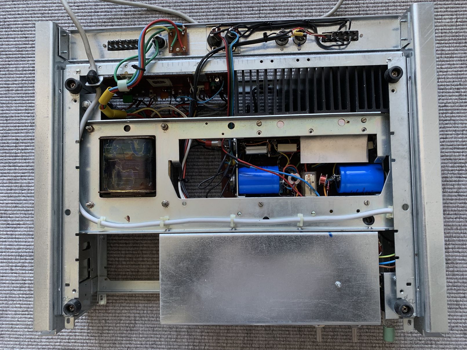 Zunächst habe ich mich um die Stromversorgung gekümmert. Der Ladeelko im Netzteil wurde als erstes erneuert (rechts oben im Bild). Die 30V-Versorgung für den Vorverstärker auf der (senkrecht stehenden) Netzteilplatine wurde hier nicht mehr benötigt; die zugehörigen Bauteile wurden deshalb entfernt.